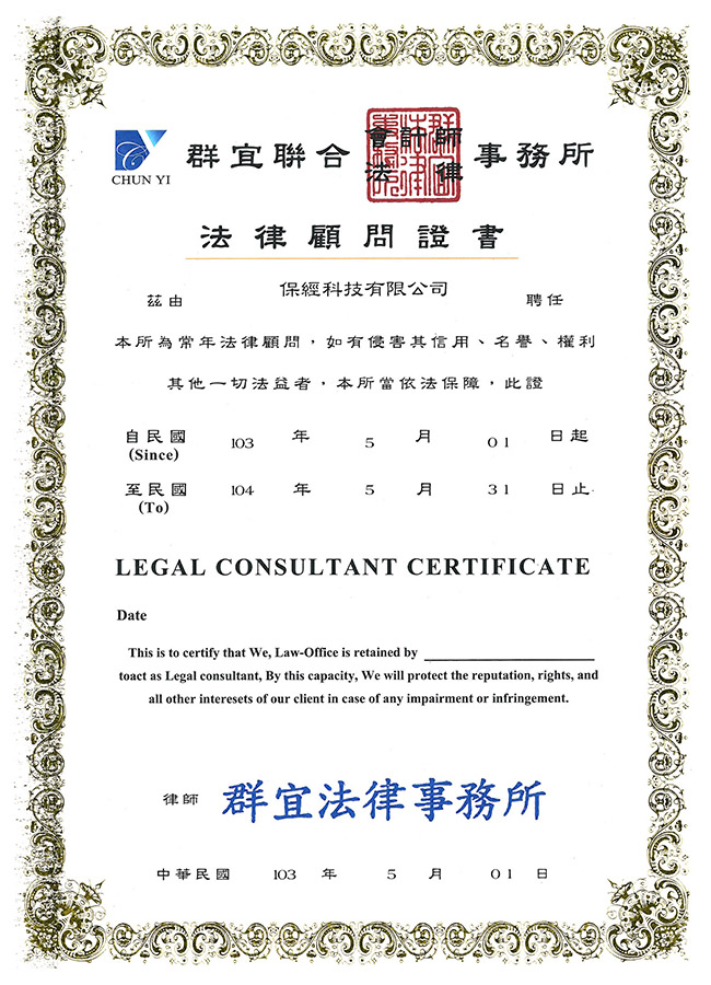 本公司聘請群宜聯合會計師/法律事務所,為本公司的常年法律顧問。 並已於2018年6月12日依ISO/IEC 27001:2013評審完成對其資訊安全管理系統之驗證。 經理人擁有「國際專案管理師(Project Management Professional)」專業證照。
